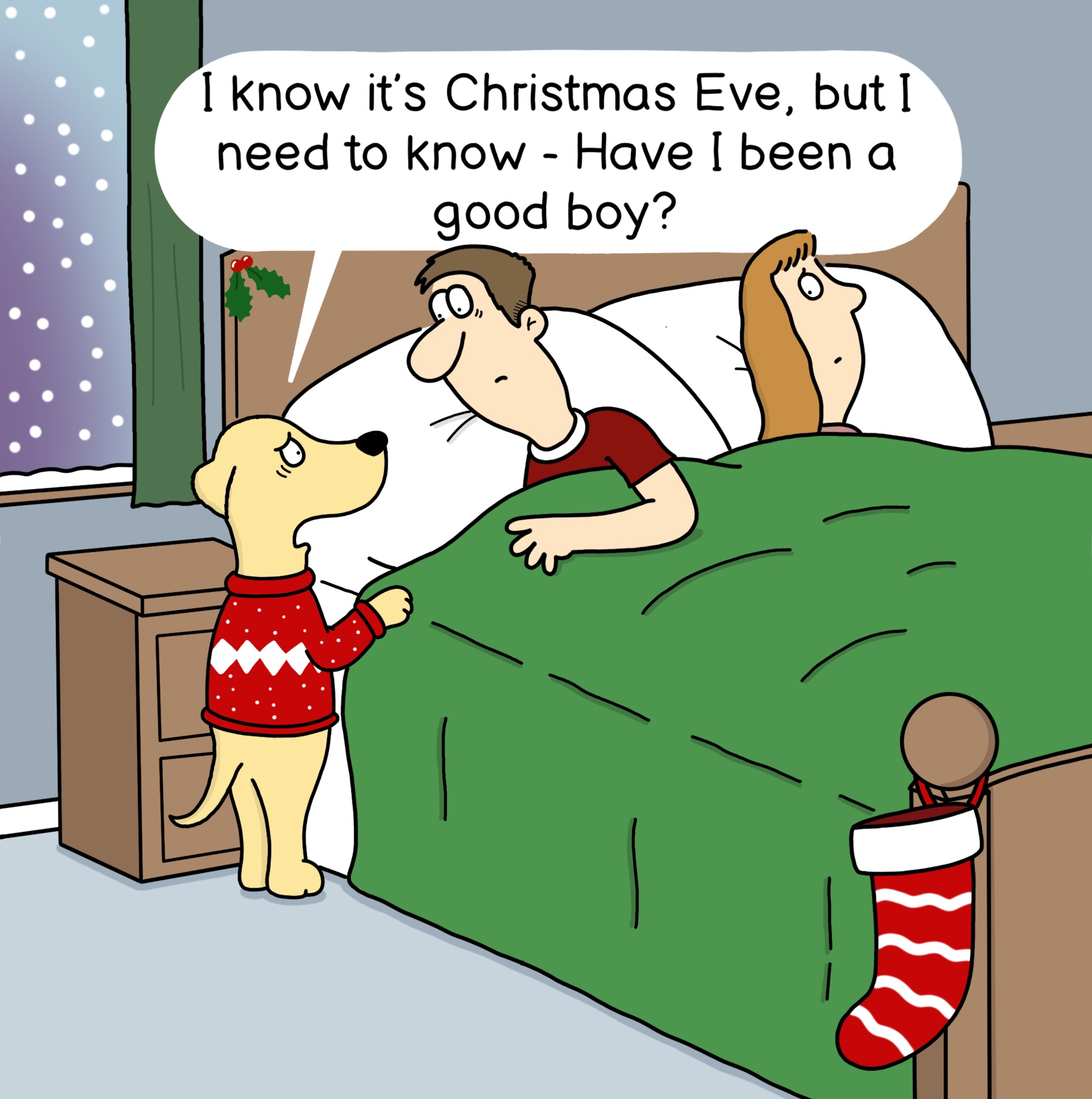 Our Funny Christmas Card For Her or For Him from the Twizler Funny Canine Christmas Range is a comical and humorous card – it is the perfect choice for wishing a special someone a very Merry Christmas. This Happy Christmas card features a dog who needs some reassurance! The words on the front of the card read ‘I know it’s Christmas Eve, but I need to know – Have I been a good boy?’ A festive card and scene is depicted. This seasons greeting card comes with a red envelope, giving it a real Christmassy effect. Designed, printed and manufactured exclusively in the UK.