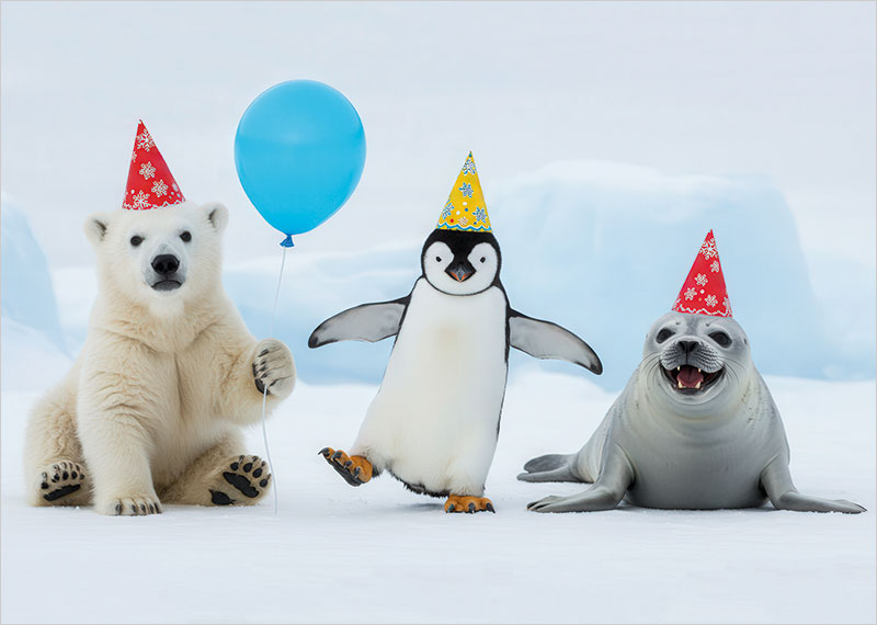 Party Animals are Gloss finished and suitable for corporate, business, company or personal use. 025-005 is a perfect choice for small to large companies. Our Party Animals Christmas cards are printed onto a premium thickness board, acquired only from sustainable sources and produced in the UK. Your inside personalisation is peronalised directly onto the card. Party Animals are sized at 210x148mm.